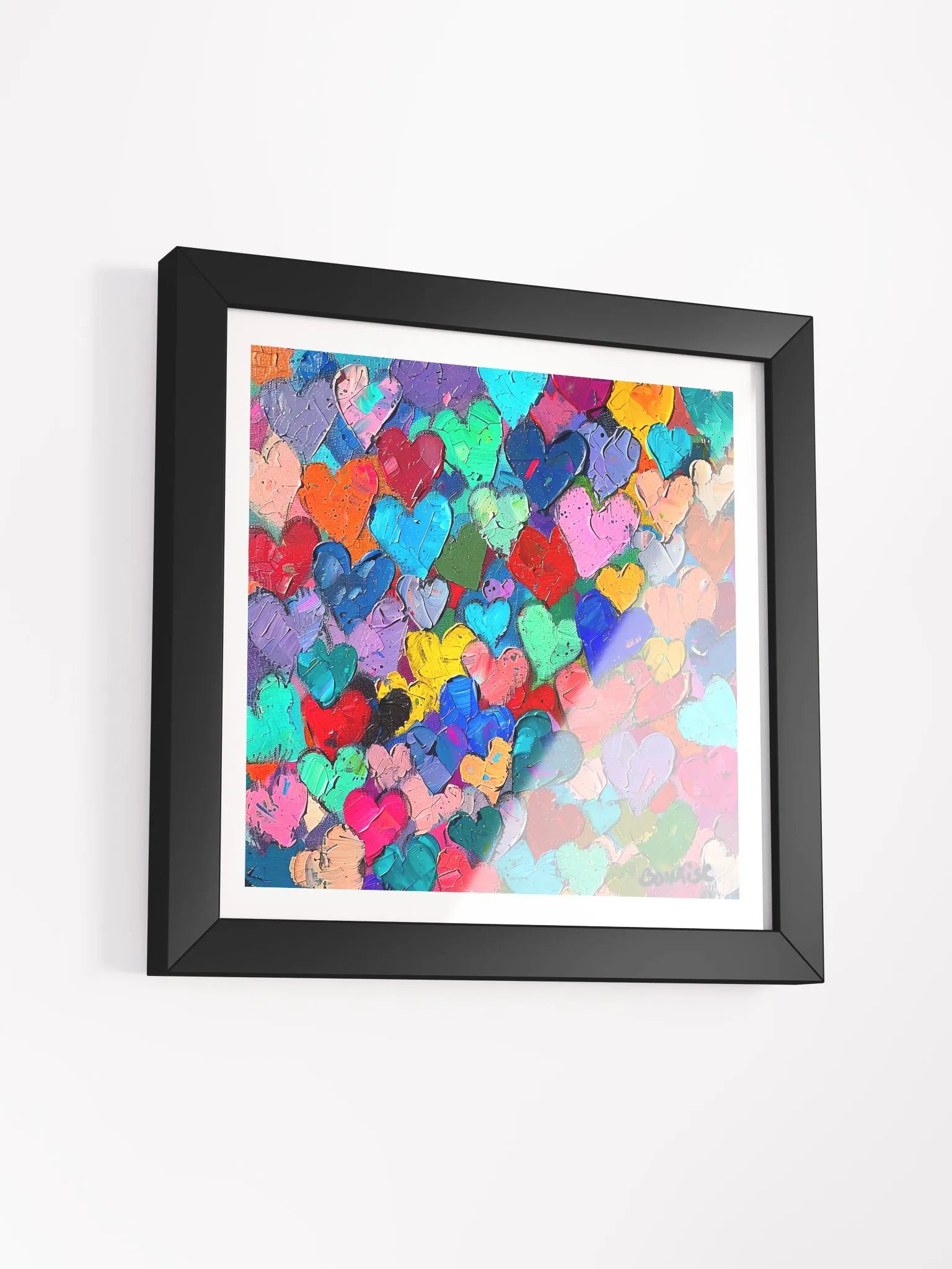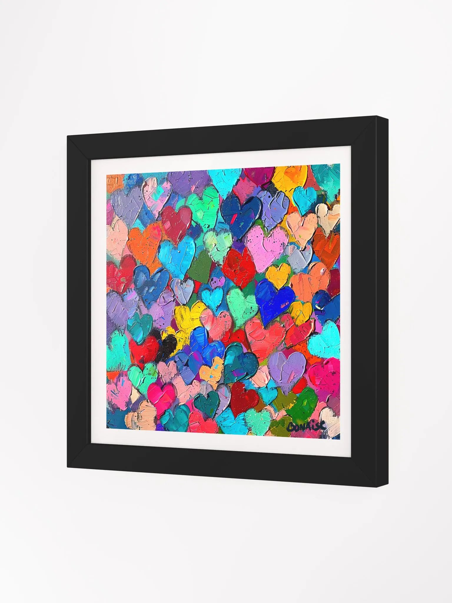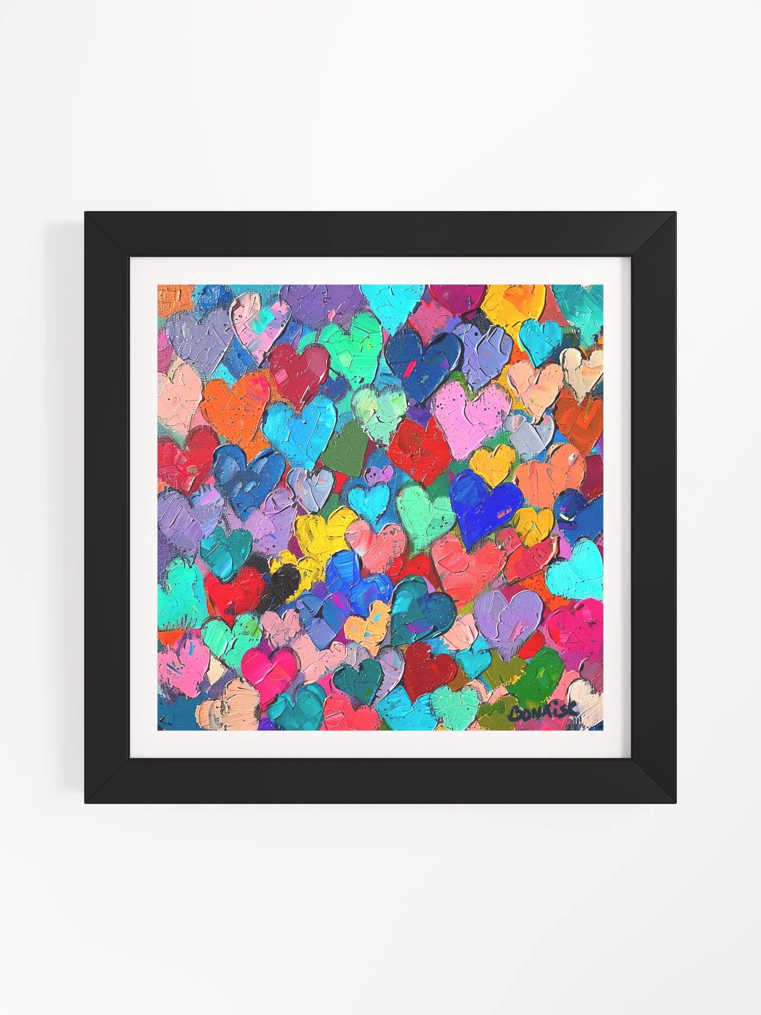 Vibrant matte poster with hand painted colorful overlapping hearts in a .75" Ayous wood frame.