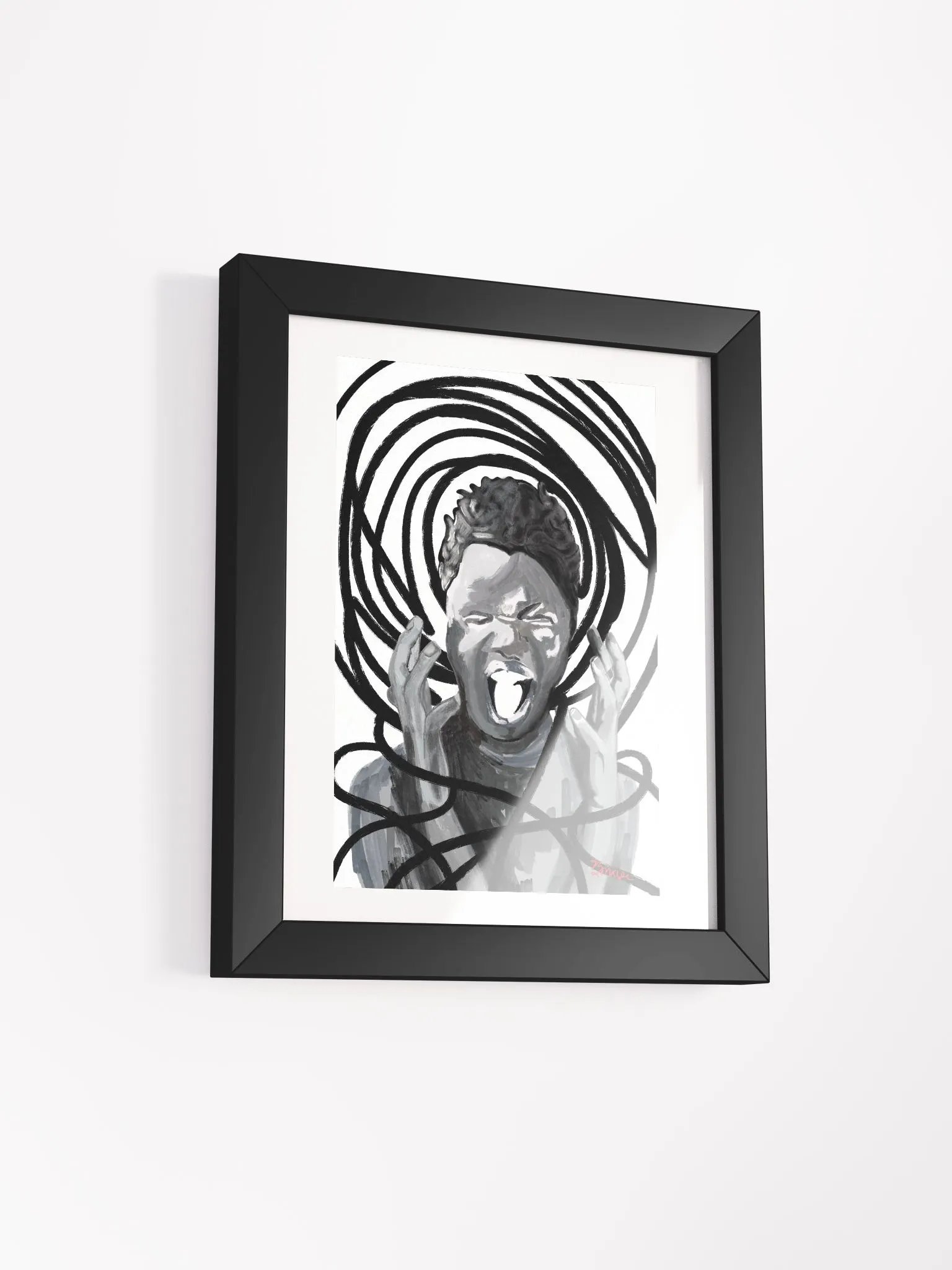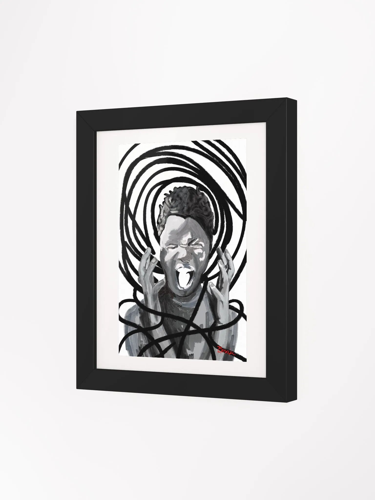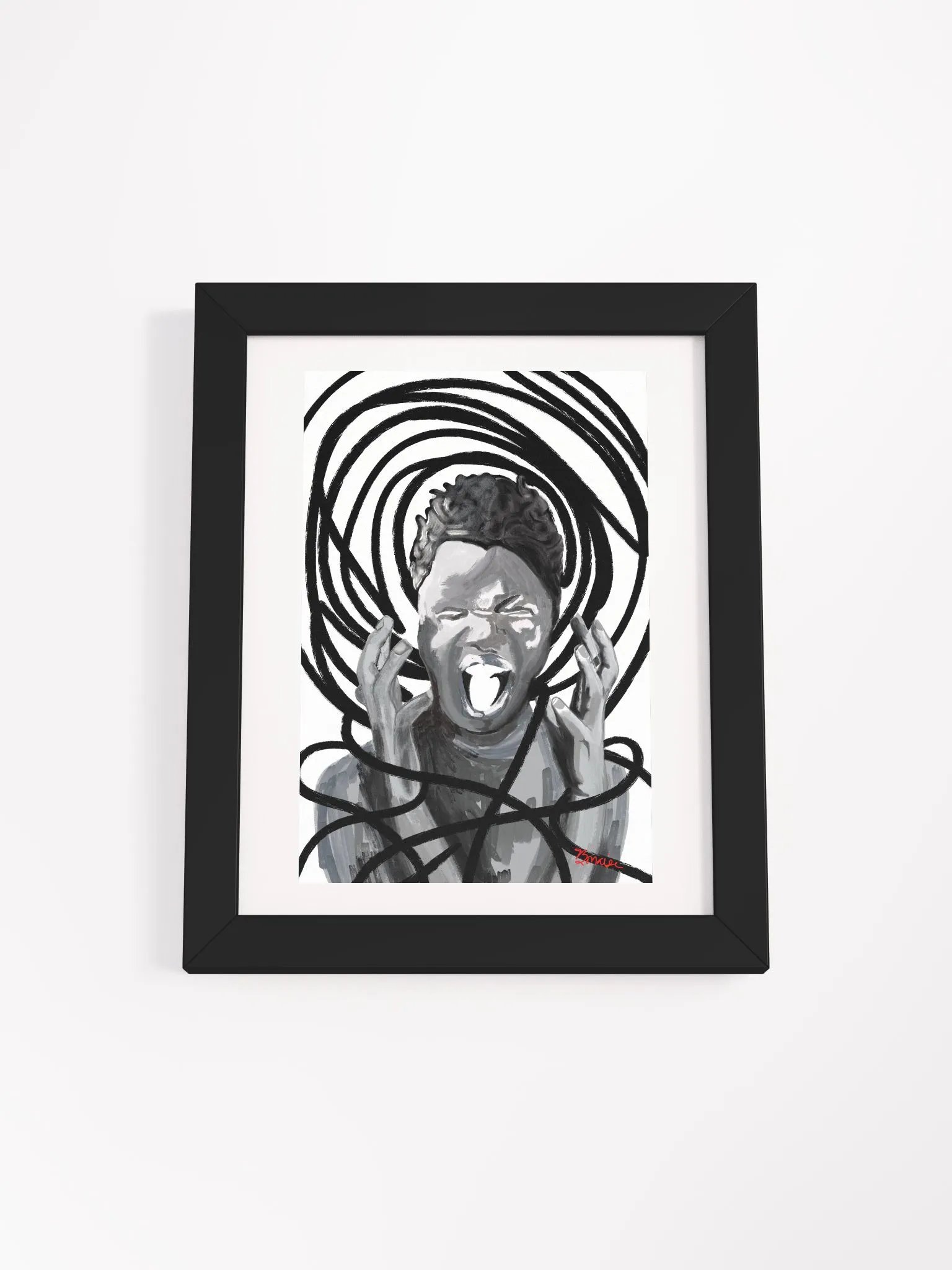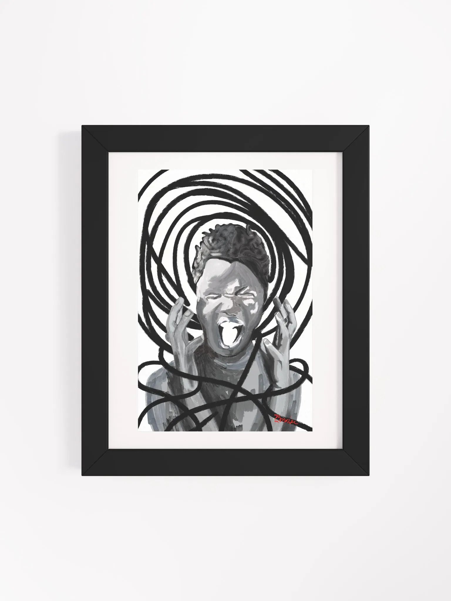 Intense grayscale illustration capturing the chaos and disorientation of the human mind. Museum-quality matte poster with eco-conscious Ayous wood frame and water-based inkjet print.