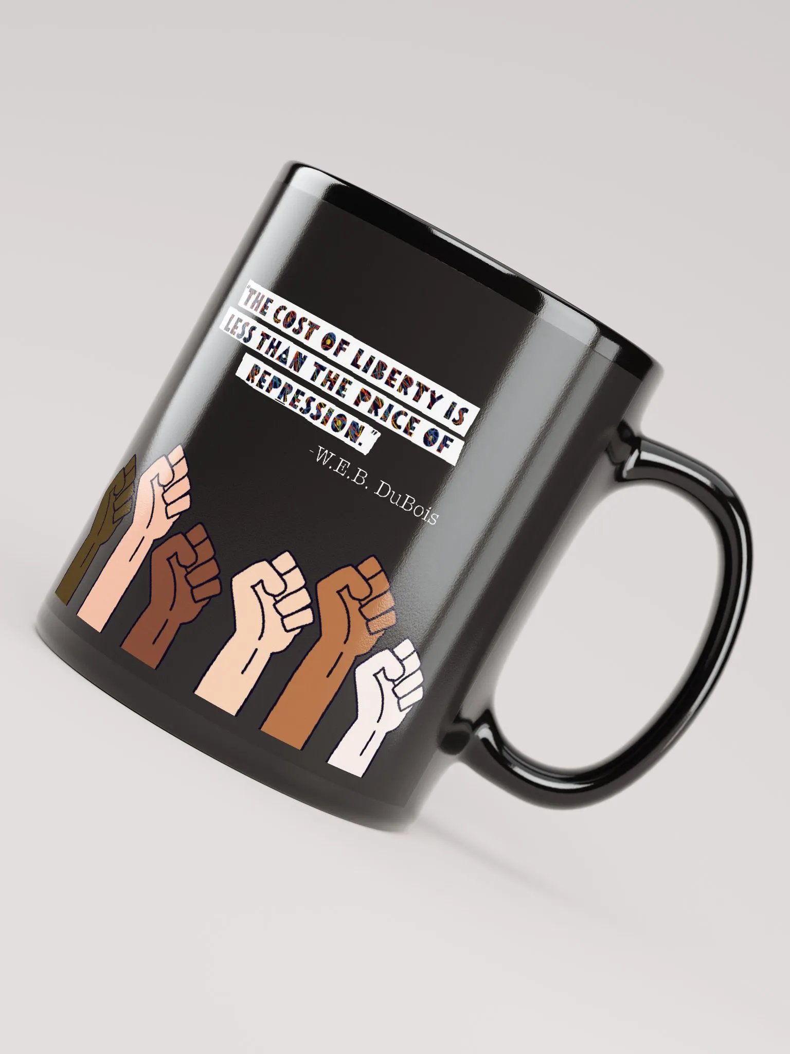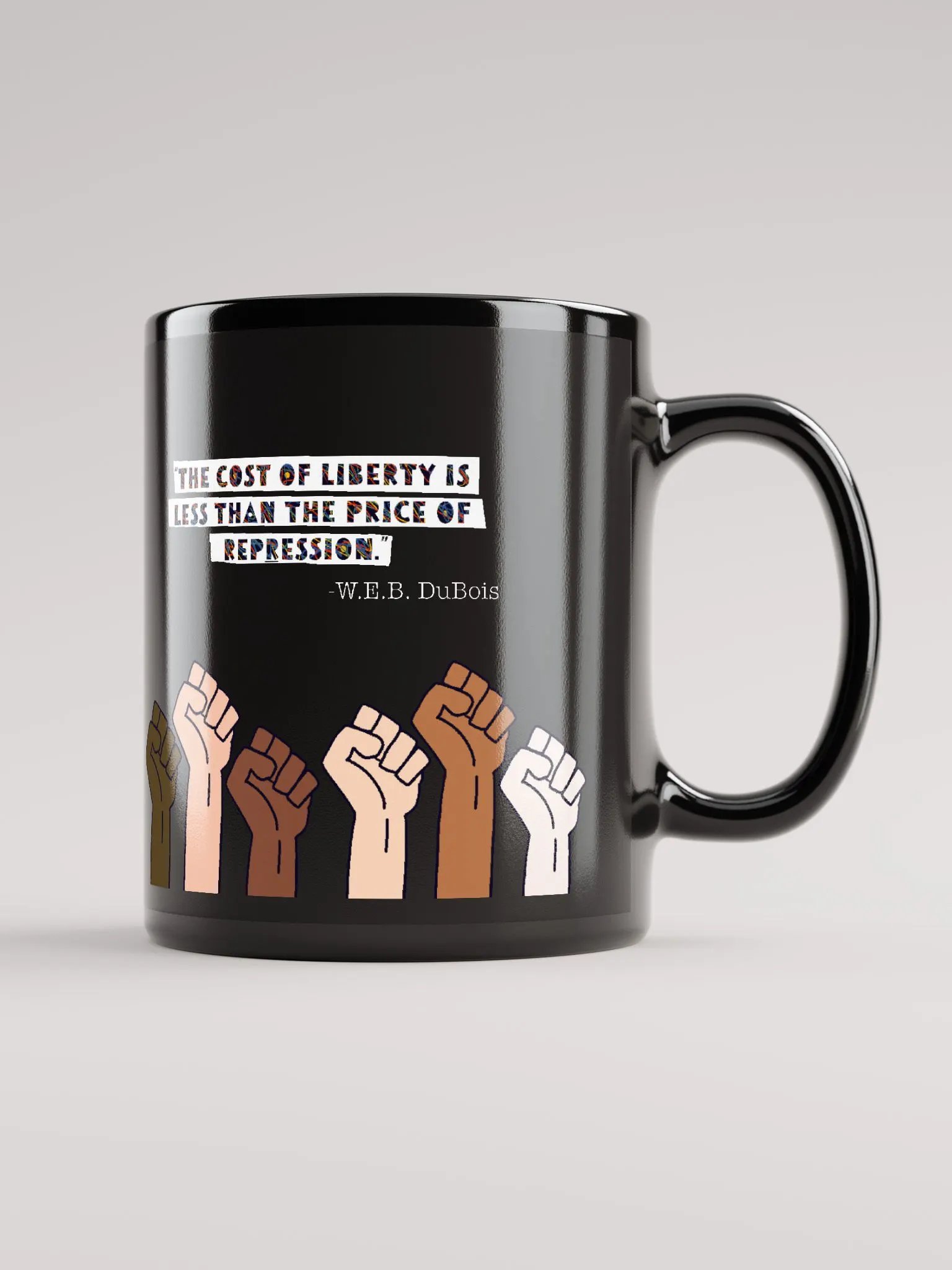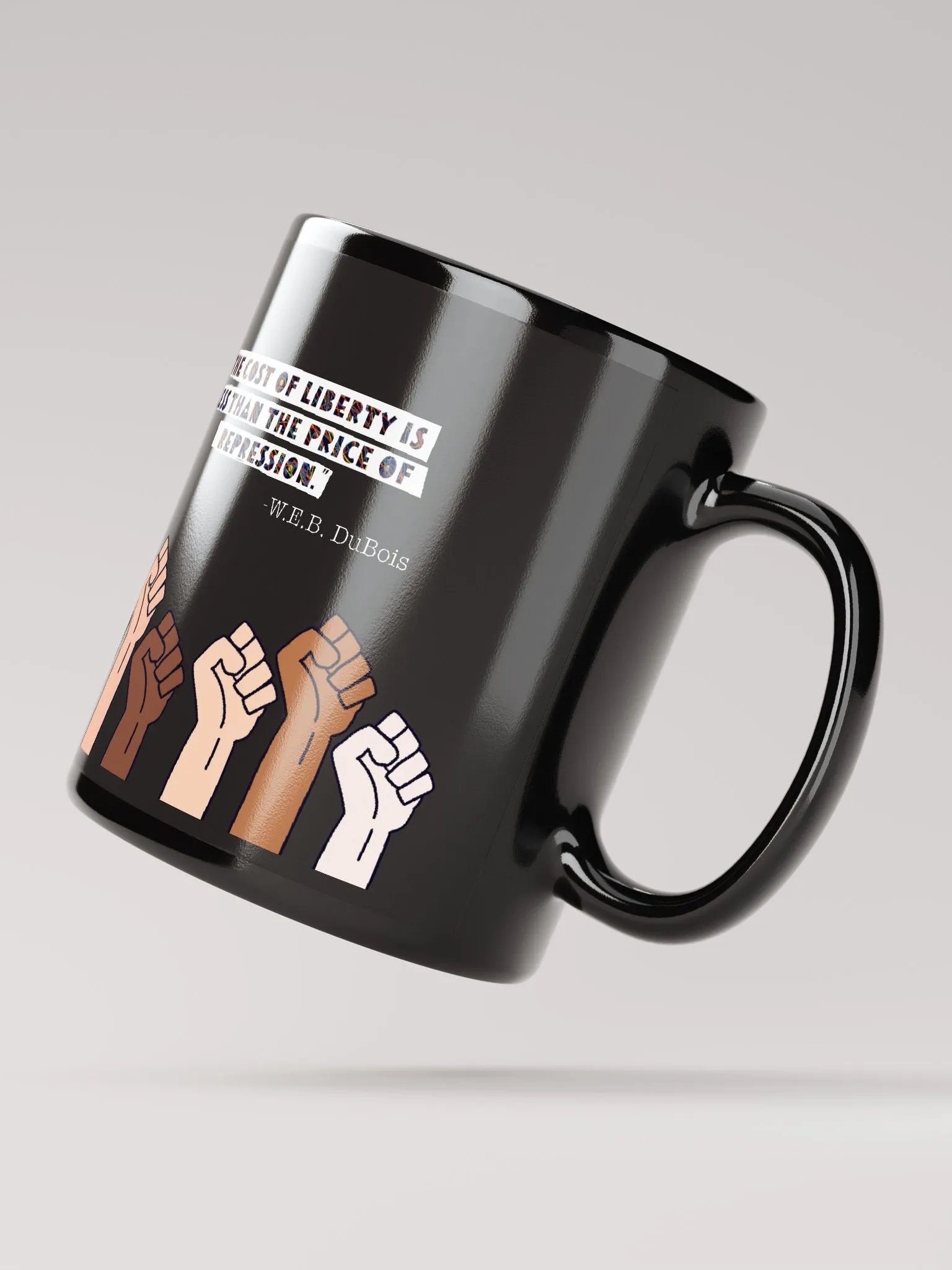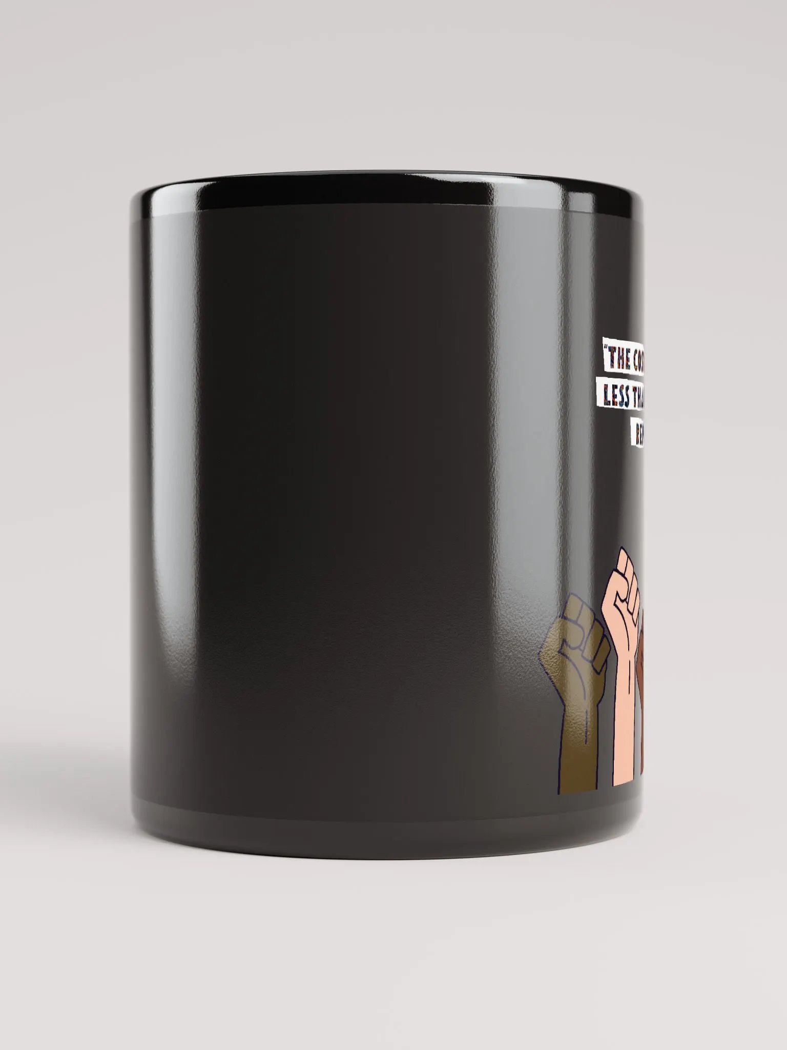Sip your favorite brew in style with our Black Glossy Mug featuring a powerful image of diverse clenched fists and a thought-provoking quote. The durable ceramic mug with a glossy black finish is a perfect addition to your collection. Not microwave or dishwasher safe.